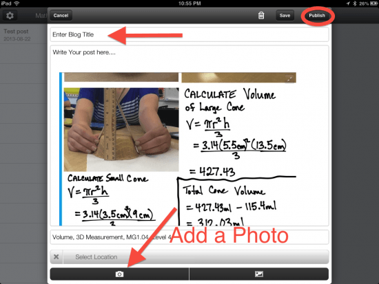 Students can now login to the Blogger iPad app and begin creating content. Just by reading some of the creative blog titles students have used makes me think that I want to allow students to blog about other topics on their own time as well. We will use labels (categories) to keep things organized and I will be allowing students to label posts unrelated to math as something like “non-math”, “unrelated” or “naddamath” – whatever they want.